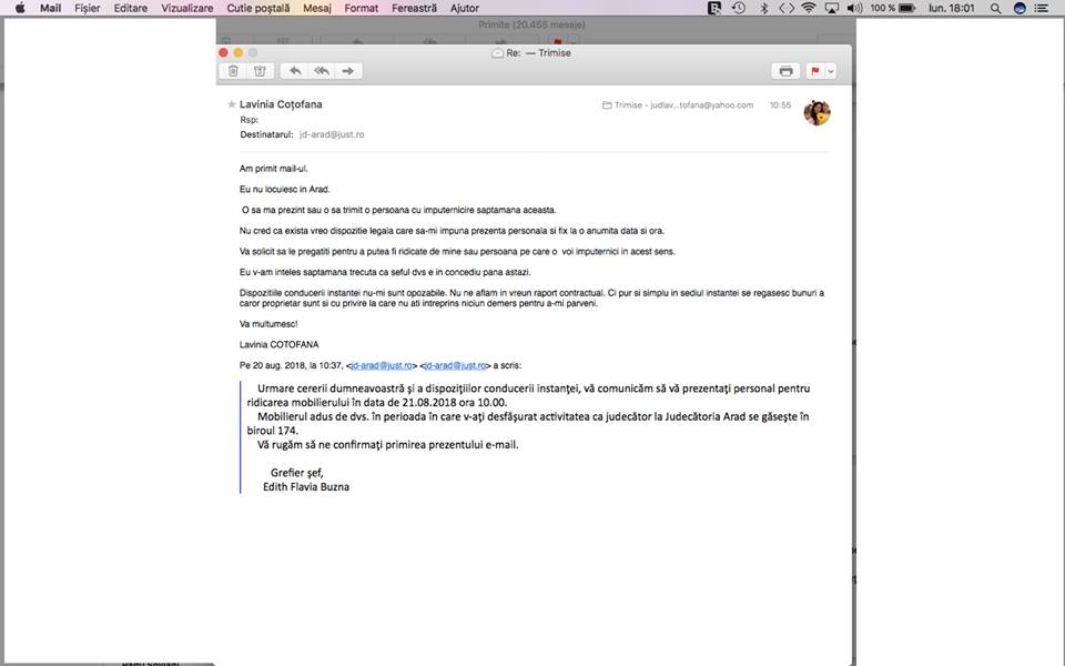 La câteva minute am primit un mail de la distinsa doamna grefier șef în care mă soma, conform dispozițiilor conducerii instanței, sa ma prezint maine, orele 10.00 si neapărat personal sa ridic mobilierul.