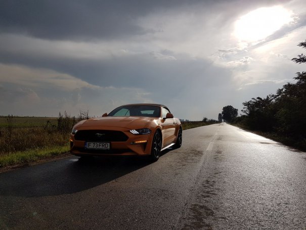 În schimb, ridicarea capotei îţi dezvăluie pe deplin motivul pentru care Ford susţine că aceasta este o versiune europeană, diferită de cea comercializată în Statele Unite. Deşi este disponibil la noi şi în configuraţia cu motor V8 de 5.0 litri, Mustangul care face obiectul testului Capital este dotat cu propulsorul EcoBoost de 2.3 litri care dezvoltă 290 CP. În trafic, mai ales atunci când parcurgi drumuri liniştite de munte, pline de viraje, sunetul acestui motor este complet diferit de cel al mult-lăudatului V8. În schimb, graţie dimensiunilor mai mici şi greutăţii reduse a agregatului de sub capota extrem de lungă, comportamentul rutier este îmbunătăţit sesizabil. Masele sunt mult mai bine repartizate pe punţi şi, în consecinţă, Ford Mustang Convertible virează aproape perfect, fără excesele tipic americane. Noua cutie de viteze automată cu zece trepte este însă adevăratul punct forte al maşinii. În funcţie de stilul ales prin acţionarea comutatorului de pe consola centrală, Mustang accelerează liniştit şi fără a provoca atacuri de panică partenerilor de trafic sau scoate un muget surd şi îţi lipeşte spatele de spătarul scaunului. Combinaţia EcoBoost – cutie automată cu zece trepte îşi arată avantajele şi atunci când priveşti consumul de carburant. În oraş vehiculul afişează în continuare un dezarmant 15 l / 100 km, însă odată ce se întinde la drum şi nu este selectat, de exemplu, modul „Drag Strip” noul Mustang Convetible devine mai „uman”, indicatorul arătând doar 7,5 l / 100 km.