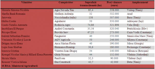 Ministerul Agriculturii şi-a dat avizul final pentru doar 15 tranzacţii cu terenuri agricole mai mari de 30 de hectare în primele opt luni ale acestui an. Acestea cumulează o suprafaţă totală de aproape 800 de hectare, iar preţul mediu de tranzacţionare a fost de 5.500 de euro/hectar. Cel mai scump teren, în suprafaţă de 85,4 hectare, a fost cumpărat la un preţ de 2,56 mil. lei, adică circa 558.000 euro. Terenul este situat în comuna Voiteg din judeţul Timiş şi a fost achiziţionat de Corvin-Petru Mateiu, prin firma sa Agro Nevada Tim, de la Simona-Nicoleta Morariu, potrivit informaţiilor publicate de Ministerul Agriculturii. Cumpărătorul este unul dintre cei mai mari producători agricoli din Banat, cu un portofoliu de terenuri de peste 8.500 de hectare. Tot el a fost autorul celei mai mari tranzacţii cu teren arabil din România în anul 2015, când a cumpărat 142,2 de hectare tot în comuna Viteg la un preţ de 1,3 mil. euro. Ulterior, Mateiu a mai cumpărat 260 de hectare de teren în aceeaşi localitate pentru care a plătit 2,4 mil. euro.
