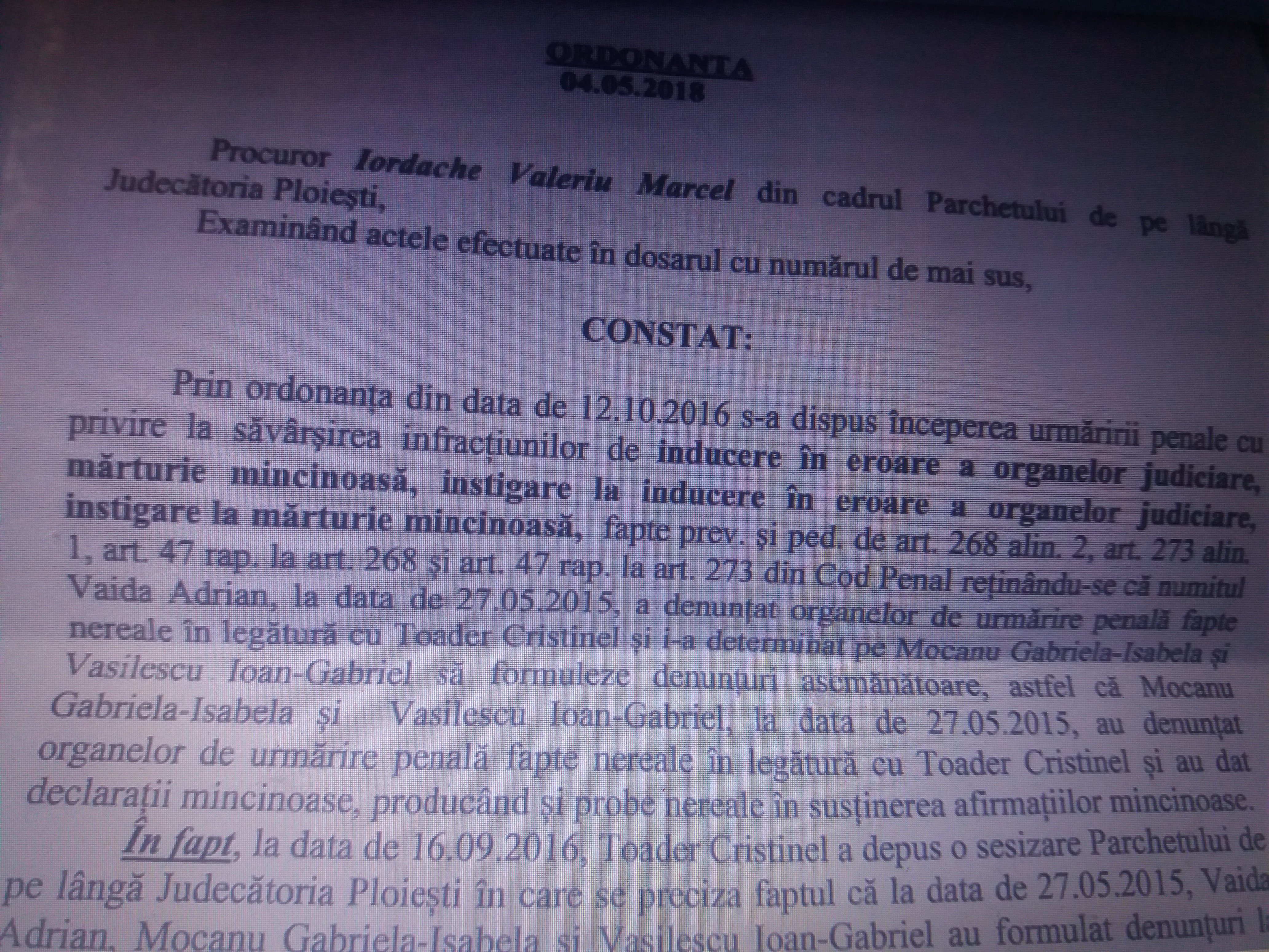 - In dosarul penal intocmit de procurorul Negulescu Mircea fostului director Toader Cristinel pe baza denunturilor mincinoase ale lui Adrian Vaida, managerul model al Politiei Locale Ploiesti s-a incurcat in propiile lui minciuni. In acest sens, la nivelul Parchetului General exista un dosar penal pe numele lui Adrian Vaida, Negulescu Mircea, Mocanu Gabriela Isabela, etc in care acestia sunt urmariti penal pentru inducerea in eroare a organelor de cercetare penala si pentru marturie mincinoasa.
