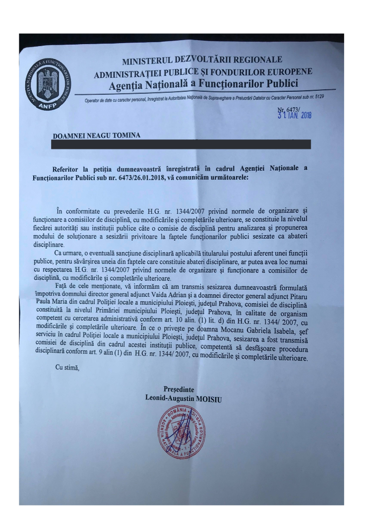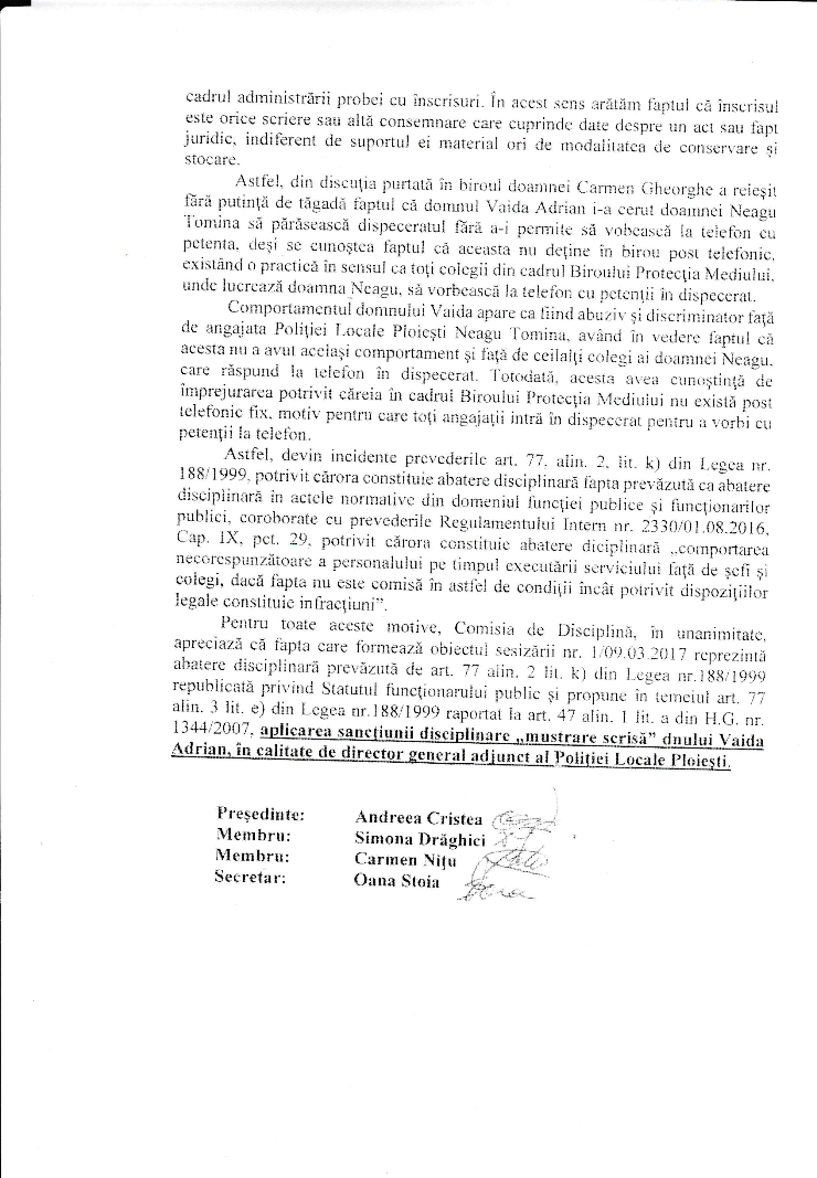 Reamintim cititorilor faptul ca doi politisti locali (Florea Daniel si Tomina Neagu) au intocmit mai multe sesizari penale pe numele lui Adrian Vaida pentru infractiunile savarsite de acesta in calitatea de manager al institutiei iar, politista locala Neagu Tomina a efectuat 3 (trei) sesizari la Comisia de Disciplina a Primariei Ploiesti pentru comportamentul neadecvat si hartuirea la care este supusa de catre Adrian Vaida. Una dintre aceste Comisii de Disciplina s-a finalizat cu sanctionarea lui Adrian Vaida cu mustrare scrisa pentru toate aceste motive, iar celelate doua comisii s-au oprit ca prin “farmec”, probabil blocate de primarul Adrian Dobre si/sau de consilierul personal al acestuia, col ® SRI, Pruna Eugen.