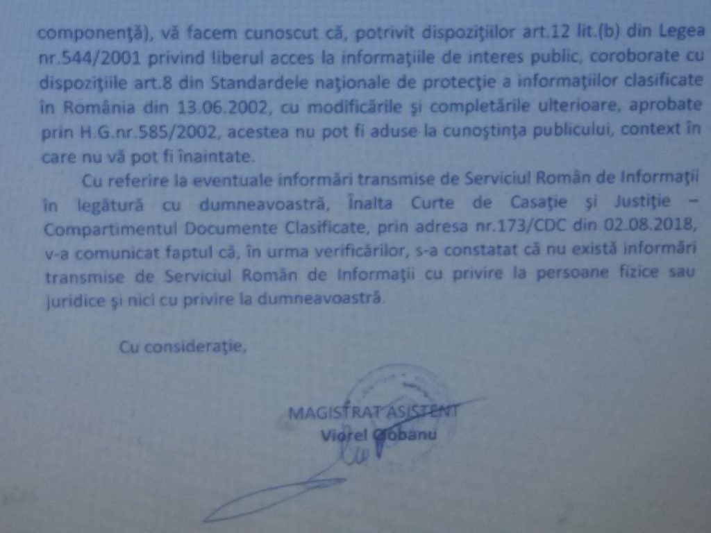 Totodată, v-am solicitat să precizați cine a făcut verificările de Securitate în cazul dumneavoastră, dacă au existat motive pentru care niciunul dintre adjuncți nu a putut să îndeplinească cerințele minime, dacă aceastea au fost concretizate într-un rezultat urmare a verificărilor de Securitate, respectiv dacă celor patru adjuncți – vicepreședinții Î.C.C.J. li s-a retras autorizația de acces la documente clasificate și dacă da, care au fost consecințele, dintre cele stipulate de art. 39 din Legea nr. 182/2002 privind protecția informațiilor clasificate.