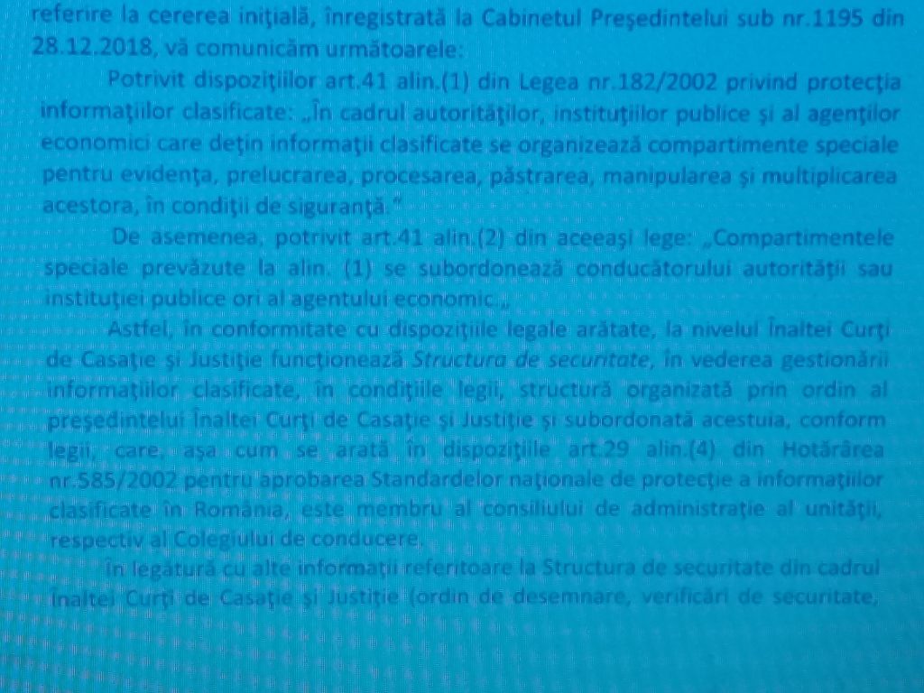 Am precizat că solicitarea subsemnatei a avut în vedere prevederile art. 10 alin. 1) din Legea nr. 182/2002 potrivit cărora instituțiile care dețin sau utilizează informații clasificate vor ține un registru de evidență a autorizațiilor acordate personalului și art. 41 din Legea nr. 182/2002 conform cărora compartimentele speciale pentru evidența, prelucrarea, procesarea, păstrarea, manipularea și multiplicarea acestora din cadrul autorităților, instituțiilor publice care dețin informații clasificate se subordonează conducătorului autorității sau instituției publice, deci președintelui ÎCCJ.