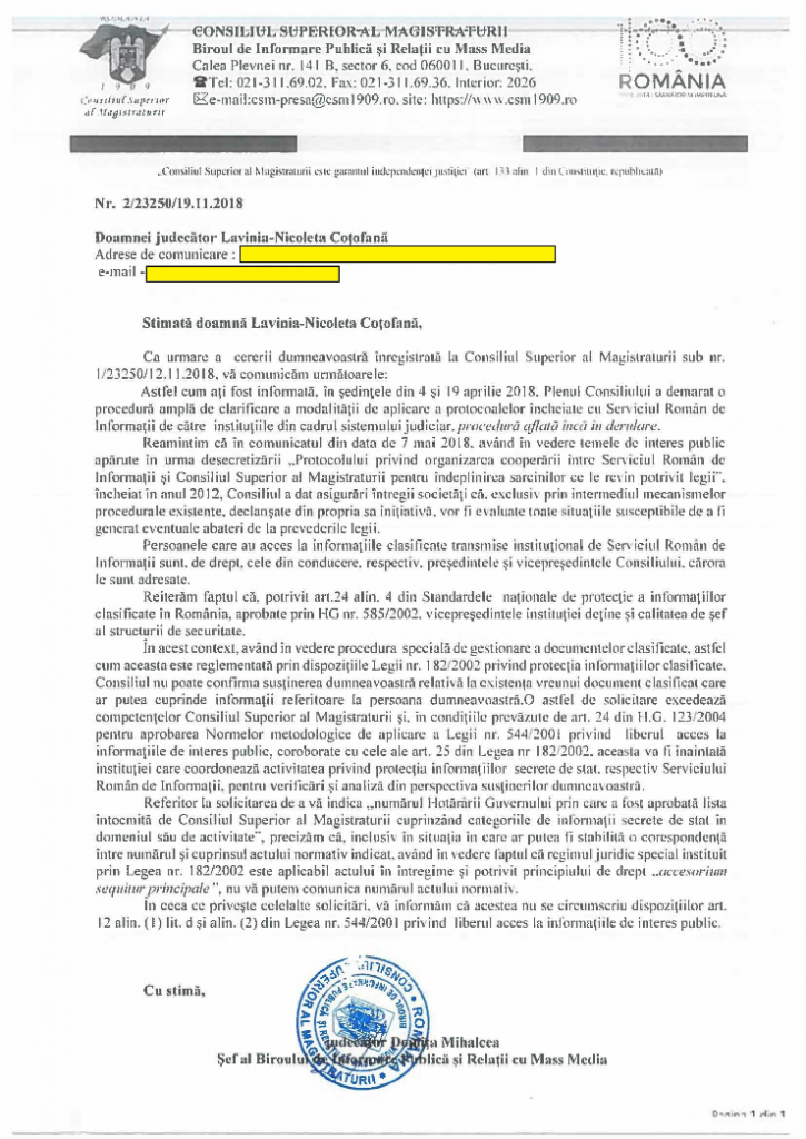 In numerele trecute va dezvaluiam ca, prin adresa nr 2/23250/19.11.2018, Consiliul Superior al Magiastraturii a “picat” in capcana intinsa de judecatoarea Lavinia Cotofana.