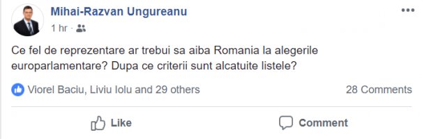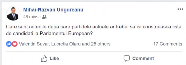 Din anul 2016, fostul şef al SIE nu mai postase nimic pe pagina lui de facebook, ultima reacţie fiind un anunţ că nu mai este şef la SIE. Vineri, 25 ianuarie, Mihai Răzvan Ungureanu a început subit să scrie pe celebra reţea de socializare. Tema abordată au fost alegerile europarlamentare. Mai întâi a început lejer cu o întrebare ţintită, dar repetată sub o altă formă într-un interval de doar o oră.