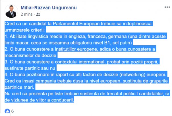 Nu cred ca prezenta pe liste trebuie sustinuta de trecutul politic l candidatilor, ci de viziunea de viitor a conducerii”, scrie Mihai Răzvan Ungureanu tot pe facebook.