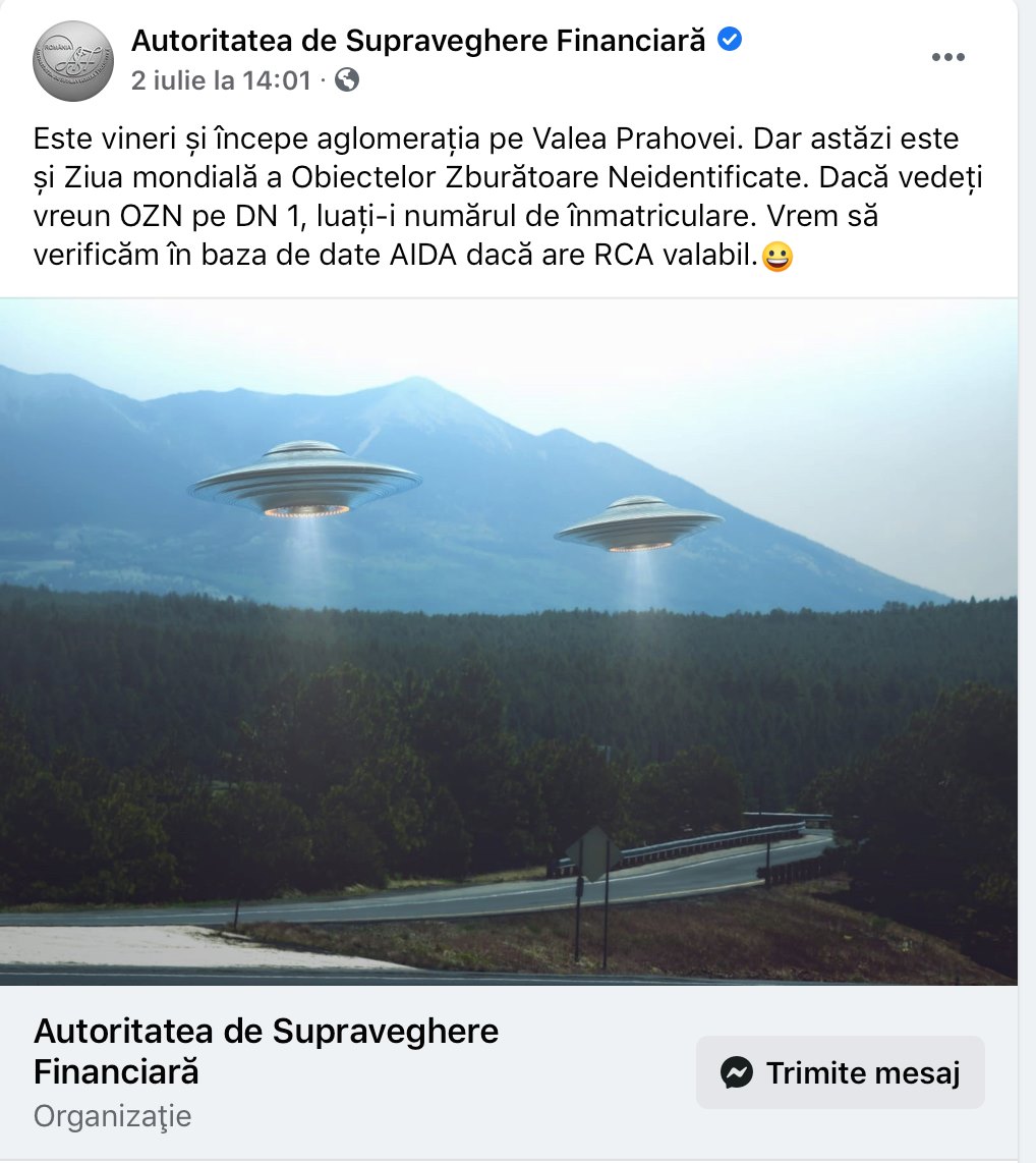 Dacă vă întrebati de ce ii platiti in fiecare lună 100.000 de lei brut Președintelui ASF, Nicu Marcu: ca să vă trimită să verificați dacă OZN-urile au RCA, așa cum rezultă de pe pagina de Facebook ASF