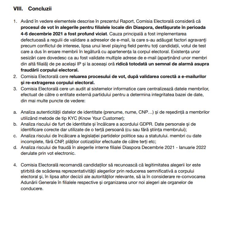 Raportul Comisiei Electorale, formate paritar din oameni USR şi PLUS, a constatat numeroase încălcări ale legii electorale pe care le-a semnalat Biroului Naţional şi a recomandat reluarea alegerilor. Acestea însă nu s-au reluat, evident. După informaţiile noastre, la nivel naţional Dacian Cioloş a dispus crearea unei comisii care să verifice acuzaţiile.