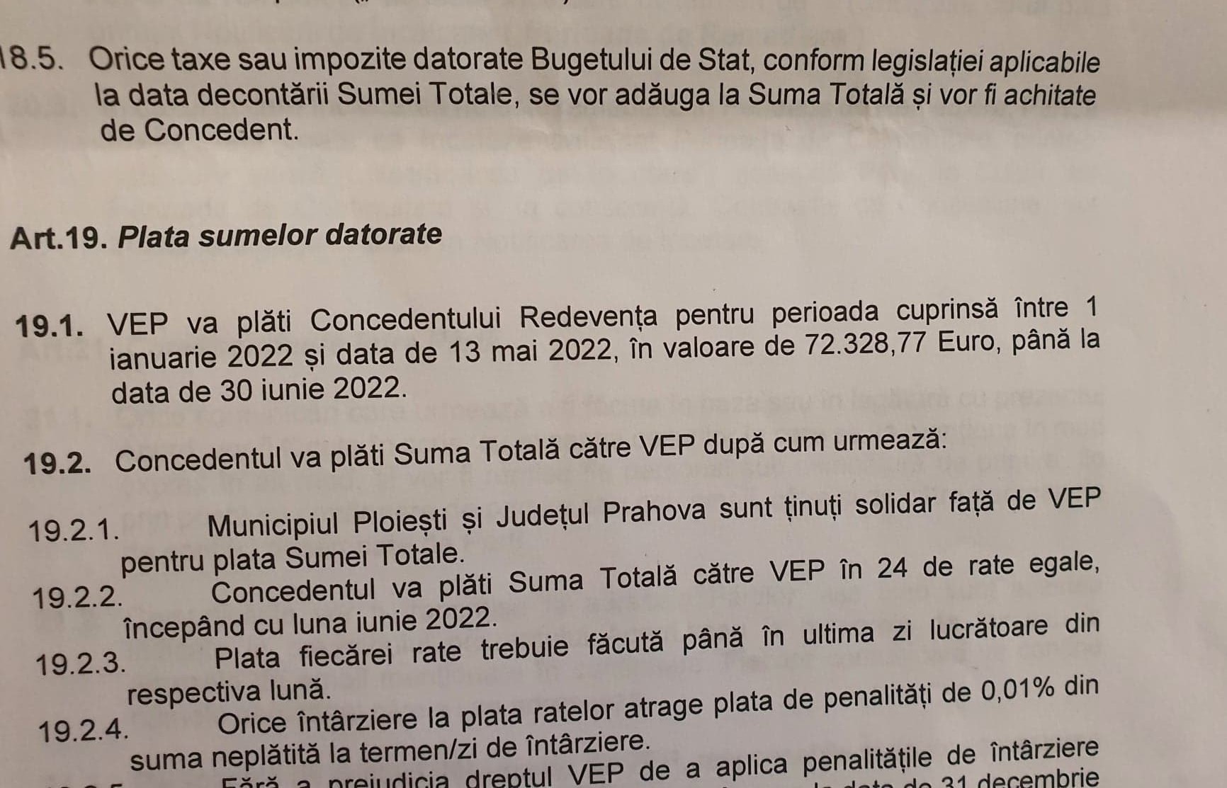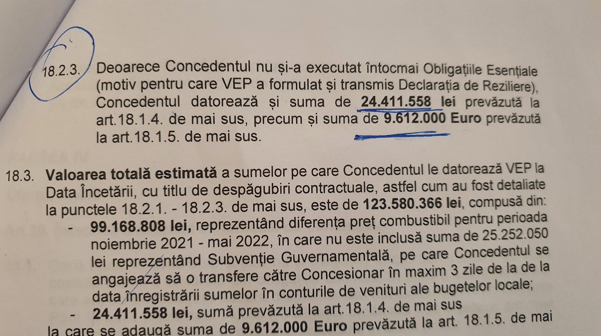 Deoarece Concedentul nu si-a executat intocmai Obligatiile Esentiale (moriv pentru care VEP a formulat si transmis Declaratia de Reziliere), Concedentul datoreaza si suma de 24.411.588 lei prevazuta in art 181.4 de mai sus, precum si suma de 9.612.000 euro prevazuta la art 18.1.5 de mai sus.