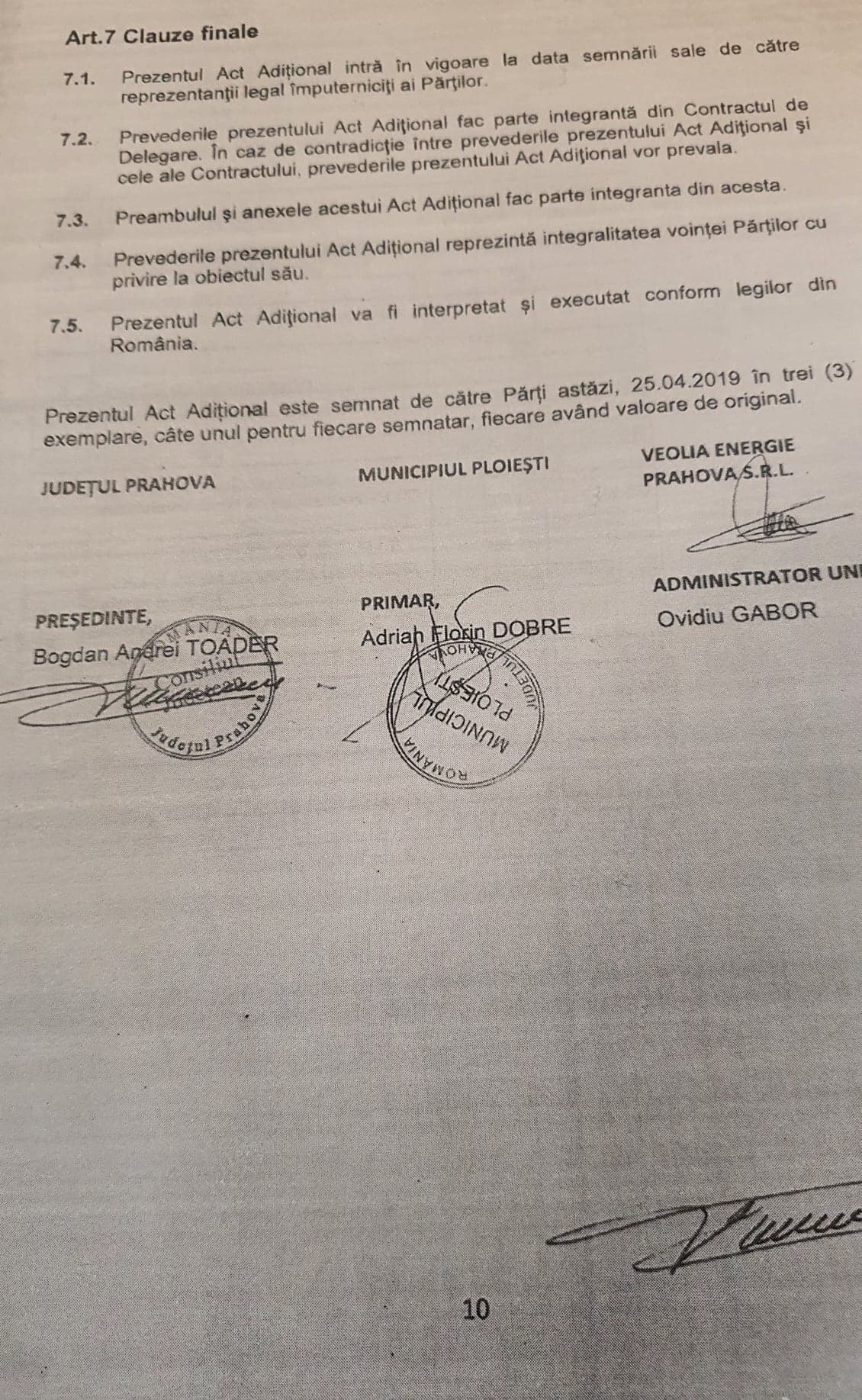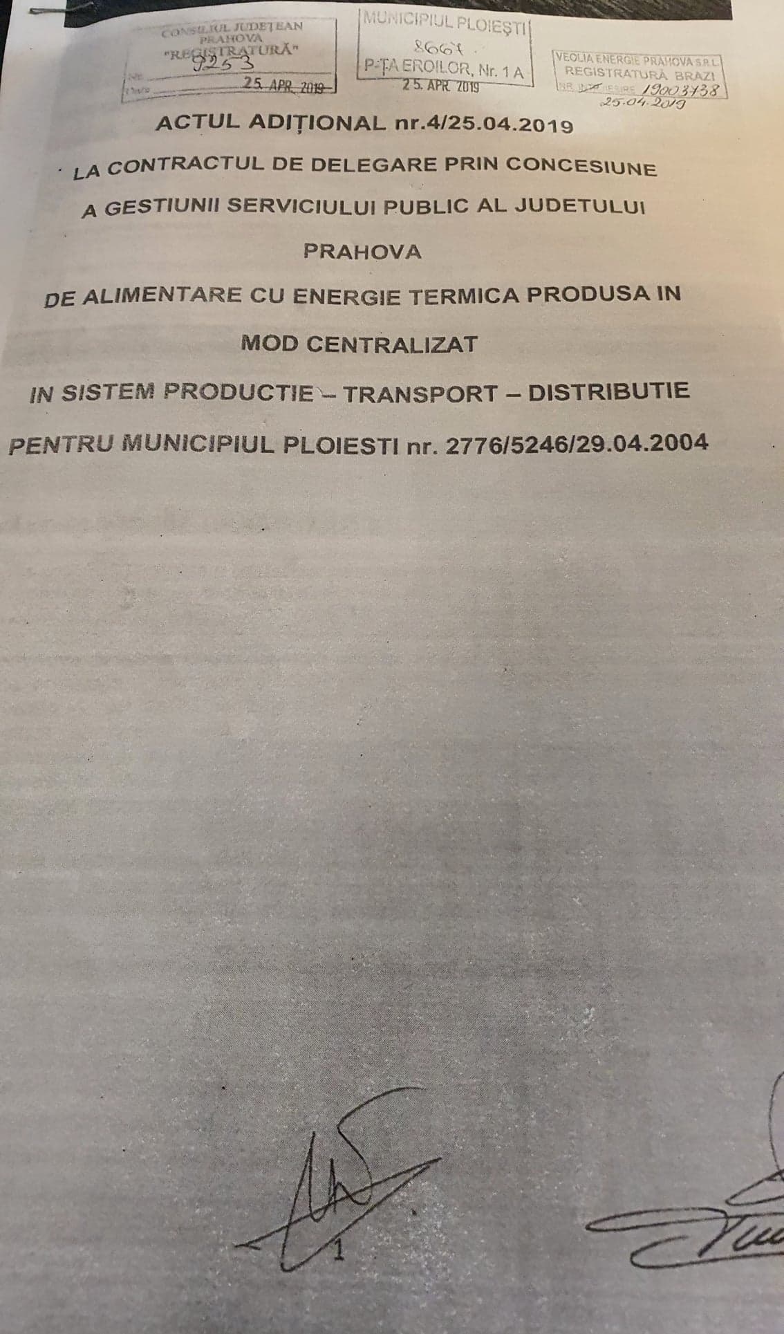 Celebrul Act Aditional nr 4 din 25.04.2019, la contractul de delegare prin concesiune a gestiunii serviciului public al judetului Prahova, de alimentare cu energie termica produsa in mod centralizat in sistem productie, transport, distributie pentru Municipiul Ploiesti nr 2776/5246/29.04 2004 a fost semnat de primarul Adrian Dobre si de Bogdan Toader, din partea CJ Prahova.