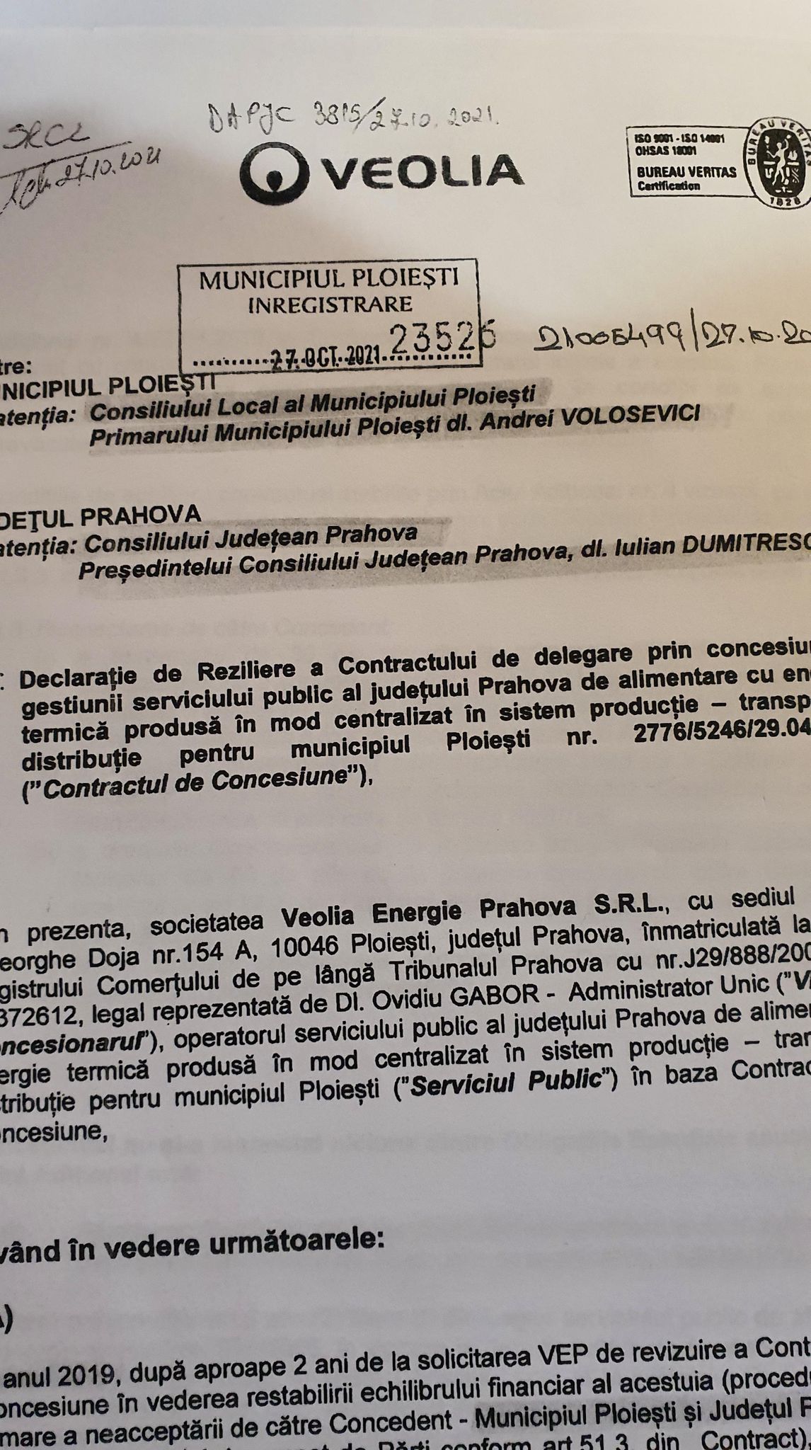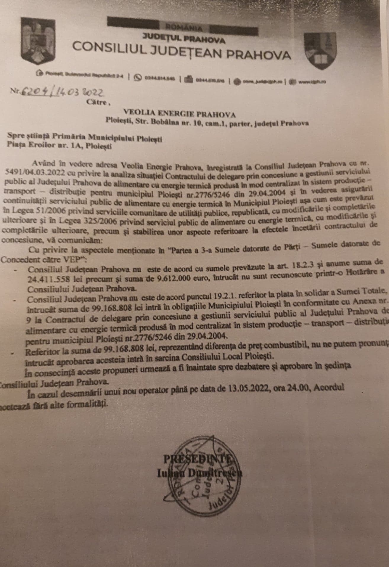 Reamintim ca, in data de 27 oct 2021, Veolia notifica atat Primarul Ploiestiului cat si Presedintele CJ Prahova cu privire la “Declaratie de Reziliere a Contractului de delegare prin concesiune a gestiunii serviciului public de alimentare cu energie termica…” Astfel, Veolia notifica data incetarii inainte de termen a Contractului de Concesiune pentru “data de 31 martie 2022 ora 24:00… “.