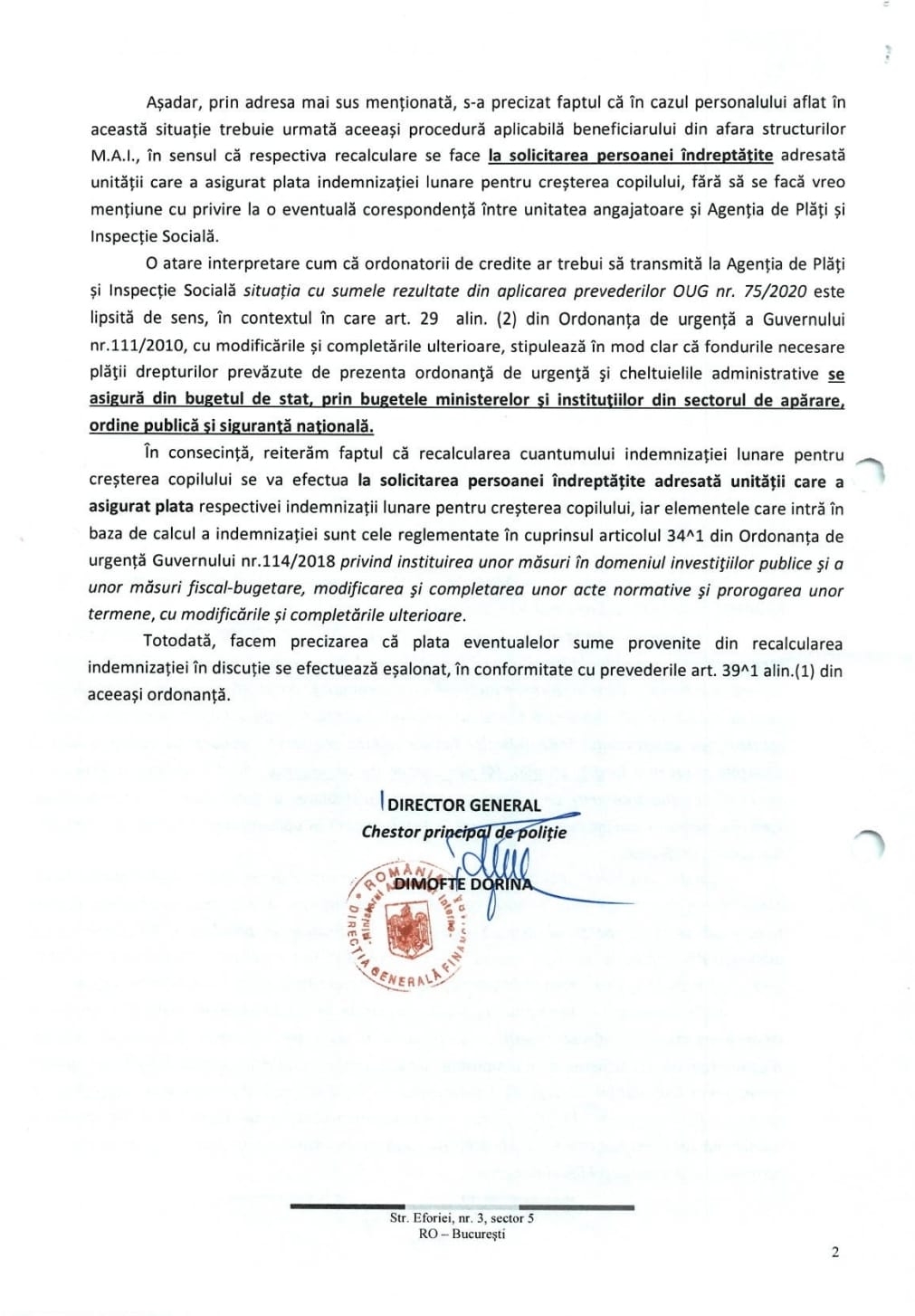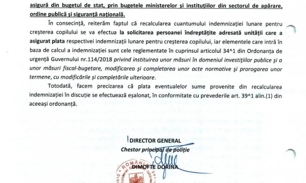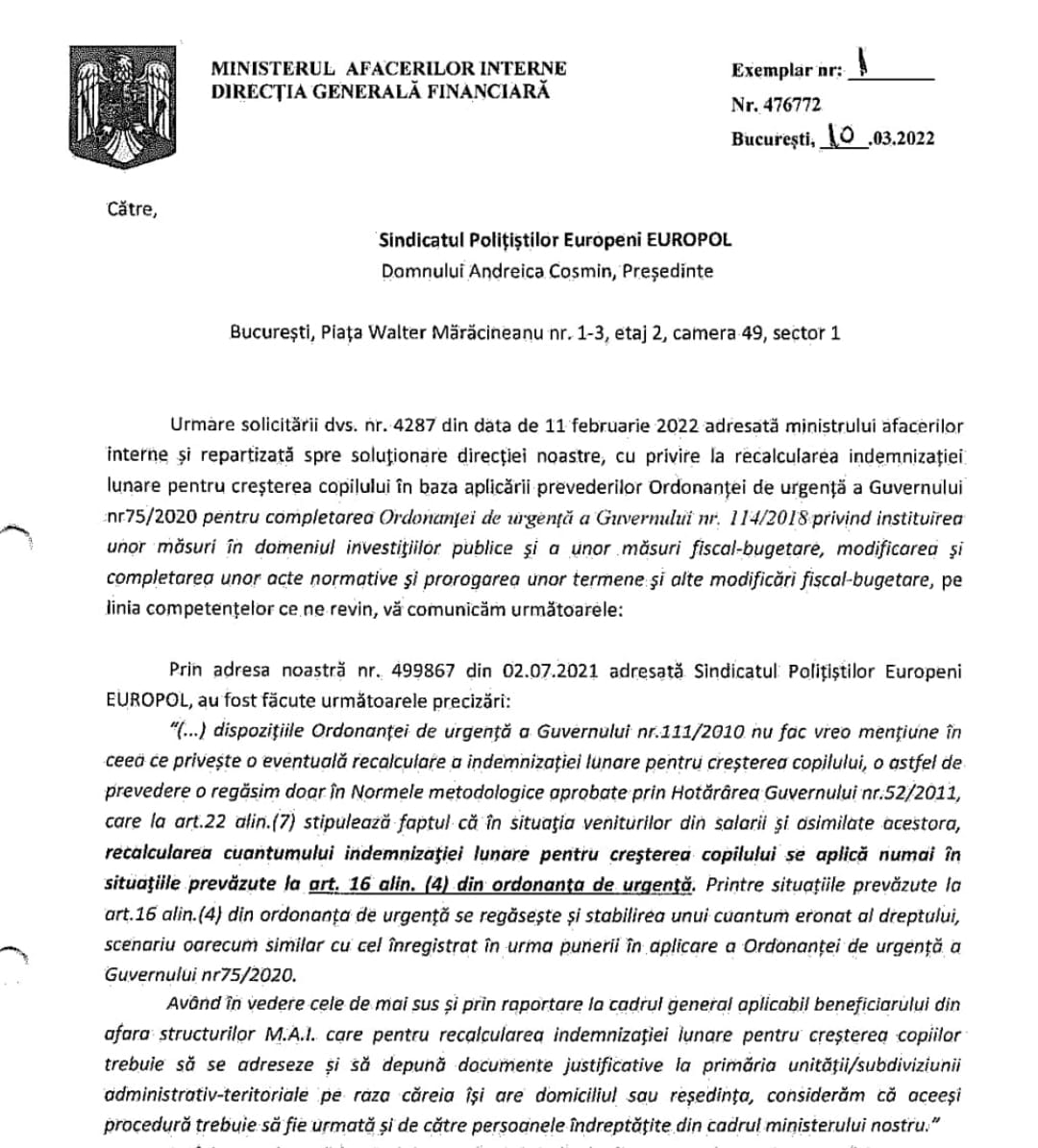 La sesizarea membrilor noștri de sindicat am solicitat MAI-ului lămuriri cu privire la modul de punere în plată a acestor drepturi. Astfel, niciun inspectorat de poliție nu a recalculat automat indemnizația de creștere a copilului pentru cei care au avut ca bază de calcul perioada 2017-2020 ca urmare a efectelor OUG 75/2020, acest lucru făcându-se doar la solicitarea expresă a polițistului. Toți colegii aflați în această situație trebuie să se adreseze printr-un raport structurilor financiare de care aparțin pentru recalcularea indemnizației, mai mentioneaza sursa citata. (Cristina T.).