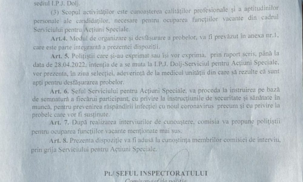 In data de 31.03.2022 este emisa Dispoziția Inspectorului Șef al IPJ Dolj cu nr. 28436 cu privire la constituirea unei comisii pentru realizarea unui interviu de cunoaștere, precedat de o preselecție care să includă verificarea practică a candidaților.