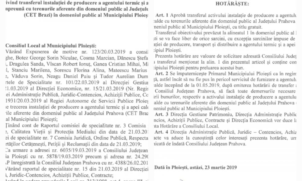 Problema furnizării apei calde în municipiul Ploieşti nu ar fi existat dacă o hotărâre din anul 2019 ar fi fost pusă în practică. Vorbim despre HCL 62/ 2019 – privind transferul instalaţiei de producere a agentului termic şi a apei calde şi a terenurilor aferente din domeniul Judeţului Prahova în domeniul public al Municipiului Ploieşti!