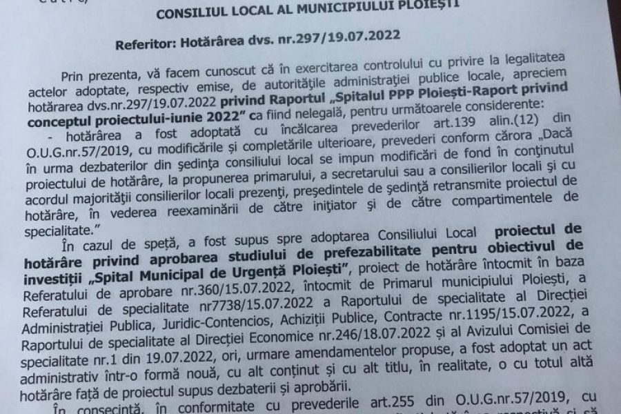 Din păcate, gestul Prefecturii Prahova nu face altceva decât să întârzie continuarea procedurilor necesare demarării construcției spitalului municipal”.