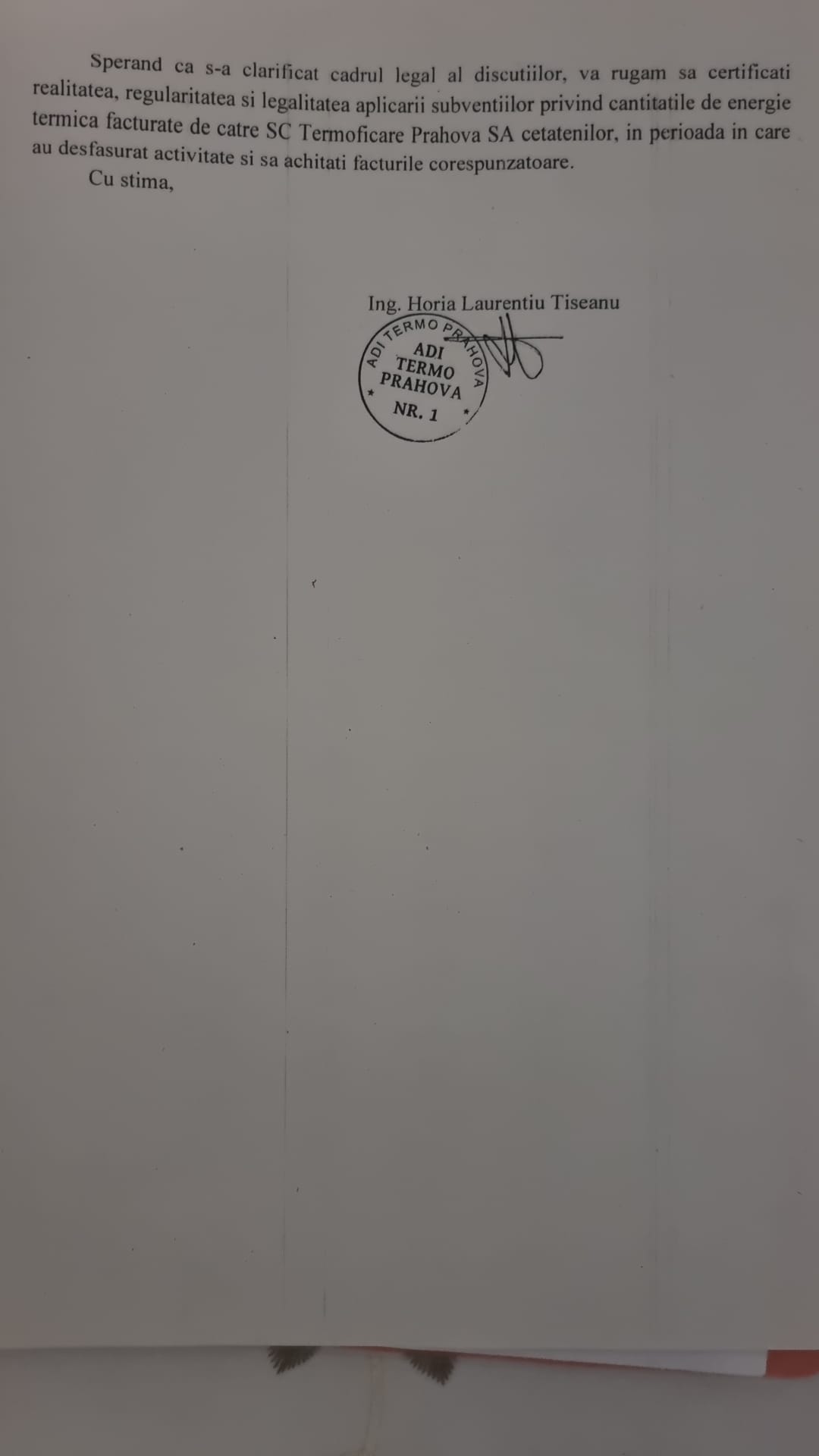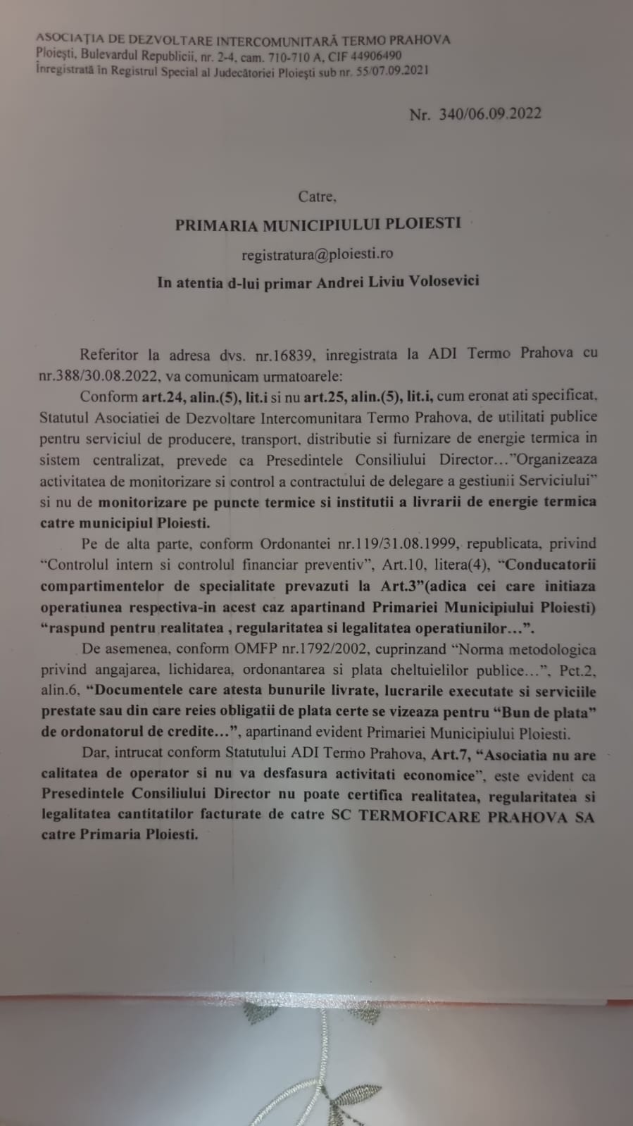 În documentul publicat la finalul textului se arată că întrucât articolul 7 din Statutul ADI Termo Prahova prevede că ”Asociația nu are calitatea de operator și nu va desfășura activități economice”, este evident că Președintele Consiliului Director nu poate certifica realitatea, regularitatea și legalitatea cantităților facturate de către Termoficare Prahova SA către Primăria Ploiești.
