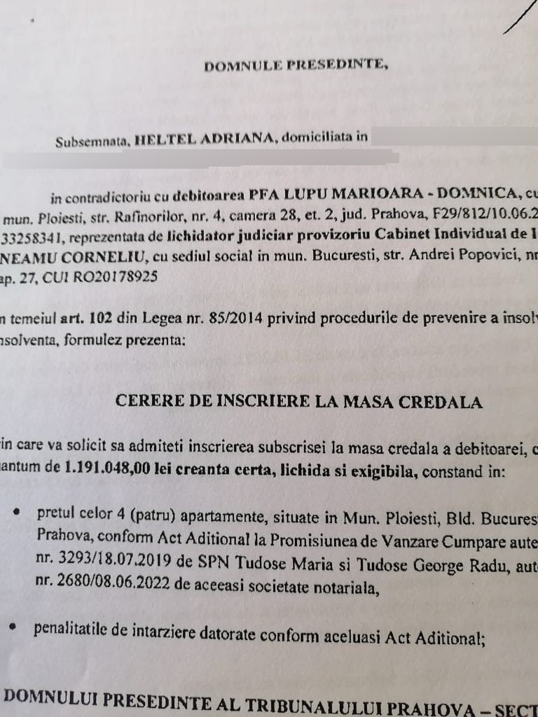 În continuarea activităţii infracţionale, un avocat din cadrul Baroului Prahova, prin înţelegere cu reprezentanții dezvoltatorului imobiliar, a folosit două societăţi comerciale, pe care le controla în fapt, pentru a declanşa procedura falimentului dezvoltatorului imobiliar, astfel încât persoanele vătămate să fie în imposibilitatea de a-şi recupera prejudiciul.
