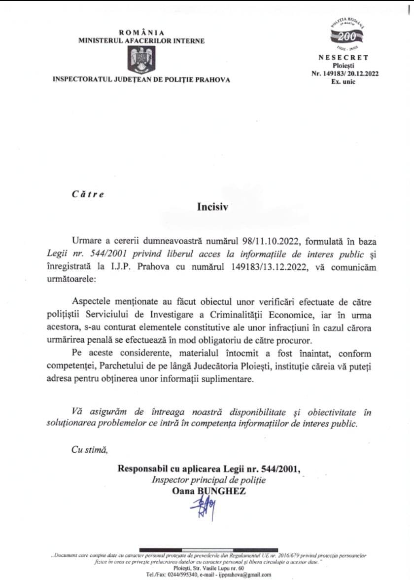 IPJ Prahova, prin adresa nr 149.193/20.12.2022, a confirmat, intr-un final, cu galusca in bratele aruncata de noi, sa le legam „mainile”, dezvaluirile ziarului Incisiv de Prahova privind caracatița imobiliară de la varful Primăriei Ploiești.