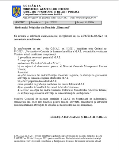 În contextul schimbului nostru de mesaje, aflu că redacția Europa Liberă a primit de la MAI o adresă cu următorul conținut: ”începând cu anul 2011 a fost constituită, prin O.M.A.I. nr. 8, Comisia de Însemne Heraldice a M.A.I. în vederea analizării și avizării însemnelor heraldice, drapelelor distinctive, ecusoanelor, emblemelor, insignelor, zilelor unităților și denumirilor onorifice propuse de structuri ale aparatului central, inspectoratele generale, organizații profesionale și alte structuri ale M.A.I. Comisia de Însemne Heraldice a M.A.I. are în componență specialiști în acest domeniu de competență – Heraldica – ce presupune studii aprofundate și o vastă experiență profesională în domeniu
