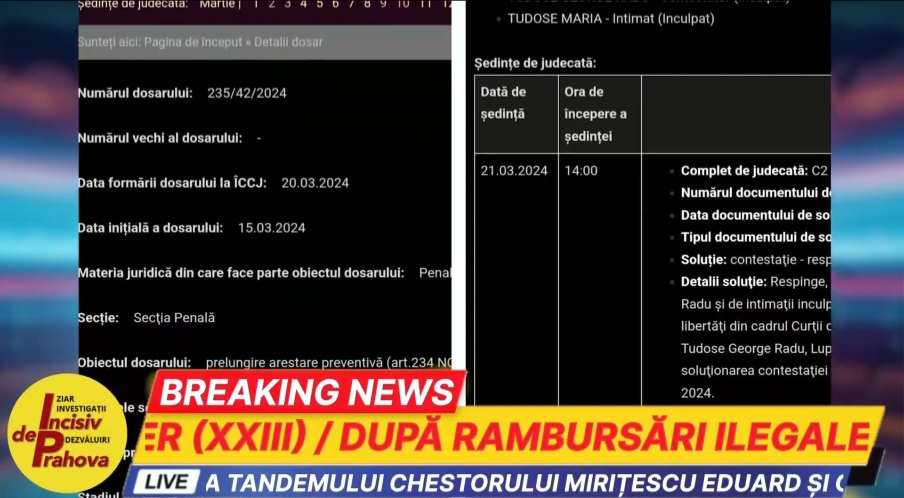 Magistrații Curtții de Apel Ploiești au decis, pe 18 martie, înlocuirea măsurii arestării preventive dispusă fată de inculpatul LUPU MIHAI și respectiv față de inculpatul NICHITA VLAD cu măsura arestului la domiciliu pentru o perioadă de 30 de zile. Totodată, a admis propunerea de prelungire a măsurii preventive a arestului la domiciliu faţă de inculpatul TUDOSE GEORGE RADU, pentru o perioadă de 30 de zile, începând cu data de 23 martie 2024 şi până la data de 21 aprilie 2024, inclusiv. Curtea de Apel (CA) Ploiești a admis propunerea de prelungire a măsurii preventive a arestului la domiciliu faţă de inculpata LUPU MĂRIOARA pentru o perioadă de 30 de zile, începând cu data de 23 martie 2024 şi până la data de 21 aprilie 2024, inclusiv și a respins cererile de înlocuire a măsurii preventive a arestării preventive, respectiv a arestului la domiciliu cu măsura controlului judiciar ca neîntemeiată.