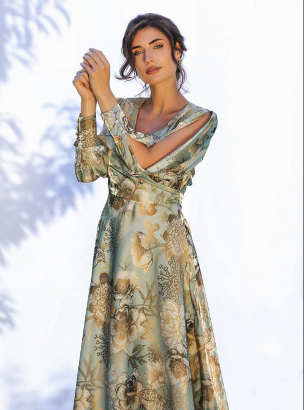 Pentru o cununie civilă în lunile septembrie și octombrie, poți alege acest model de la DAMES.  Croiul lung inspiră noblețe, iar pastelurile delicate se potrivesc perfect cu lumina caldă a toamnei.